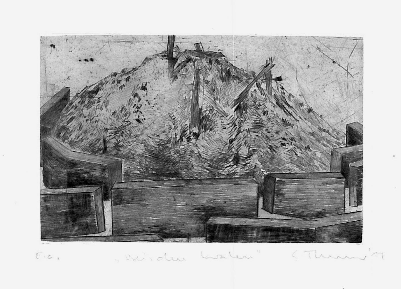 Kaltnadelradierung: "Bei den Kralen" Format 142 x 91 mm, Papierformat ca. 254 x 175 mm. Auflage XXX römisch und 40 arabisch nummerierte, signierte und betitelte Exemplare. Liegt Vorzugsausgabe A und C bei. Abbildung unten rechts.
